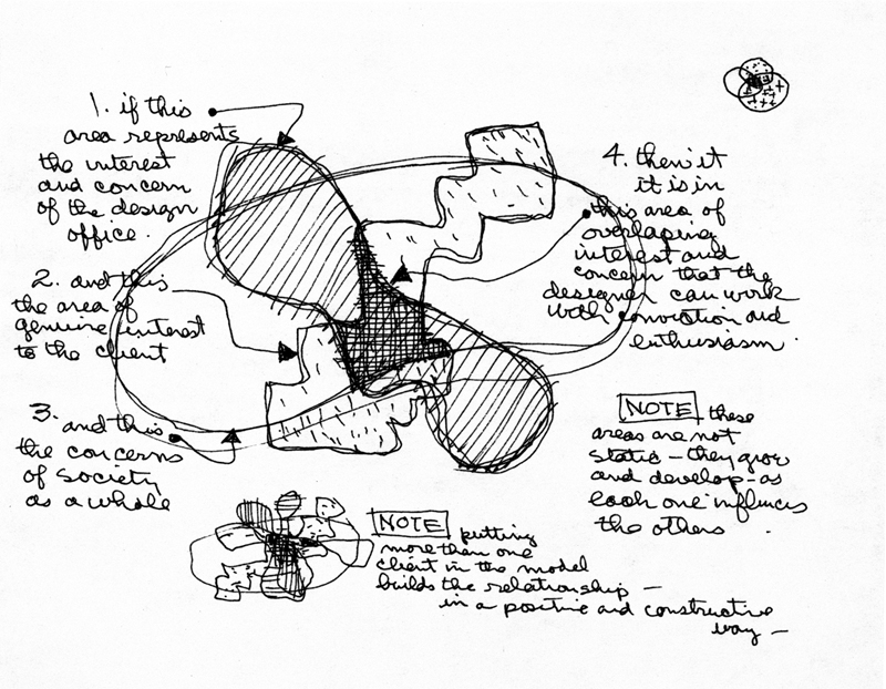 <p>According to <a href="https://www.eamesoffice.com/product/eames-design-diagram-print/">Charles Eames Venn Diagram</a> 1. the design office, 2. the client and 3. societies intersecting areas of interests and concerns delineate the boundaries of knowledge champions. And these boundaries are not static. Relationships improve by increasing the number of clients. Apart from areas of interest and concerns of the design office, client and society, there could be many other variables like environment, management, culture, language, human dignity and politics that play a significant role.</p>